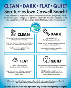 YOU CAN HELP! If you see a sea turtle mama coming onto the beach and and attempting to nest, please call our hotline immediately (910-368-6323) to notify us. During sea turtle season, we monitor 24/7. Please educate your family, friends, neighbors and especially – your renters. ALWAYS feel free to reach out to us if there is a concern, or you have questions. (All contact info is at the top of the page.)